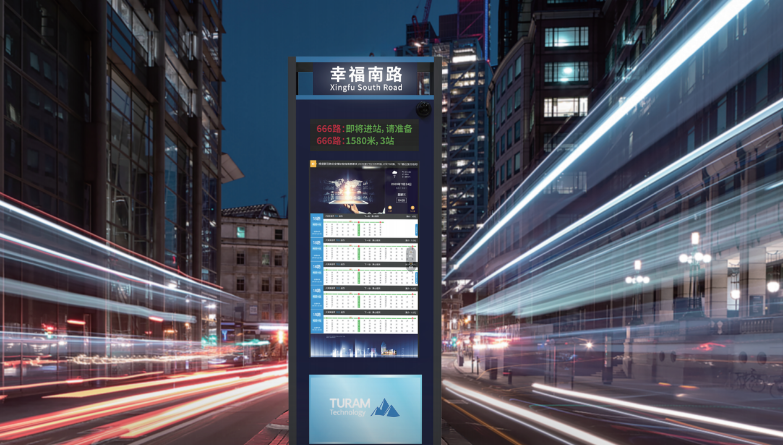智能站牌系统是多媒体科技与现代计算机通讯网络技术的结晶。智能电子站牌利用成熟的网络和视频技术,在发布GPS/北斗车辆信息的同时播放视频内容,显示时间、气象预报、政府公告等内容,改变了户外的静态单一模式,将即时性和实用性,稳定性和安全性融合在一起,集动态影视图像、静态图形、声音、文字等信息为一体,为用户提供实时、生动的画面,是信息的广度和深度得到最大程度的拓展,是智慧公交系统中“市民便捷出行”的践行者,是政府项目中一些性价比极高的便民、利民项目。